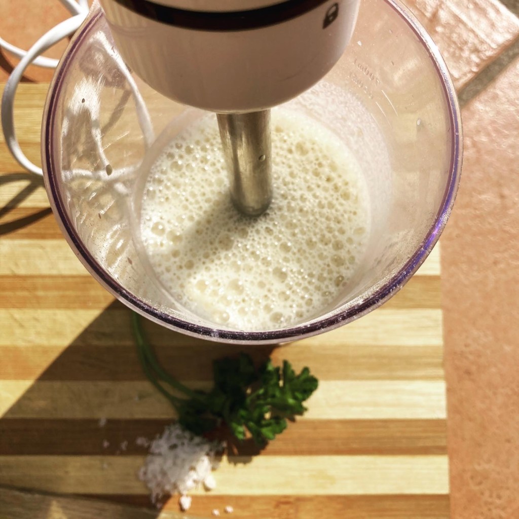 Ich gebe das Salz und das Kichererbsenmehl in ein hohes Gefäss und gieße zuerst nur ein Viertel vom Wasser dazu und mixe das ganze mit dem Pürierstab gut durch. So vermeide ich, dass sich Klümpchen bilden. Dann gieße ich vorsichtig den Rest des Wassers dazu und mixe das ganze noch einmal gut auf. Der Teig ist fertig.