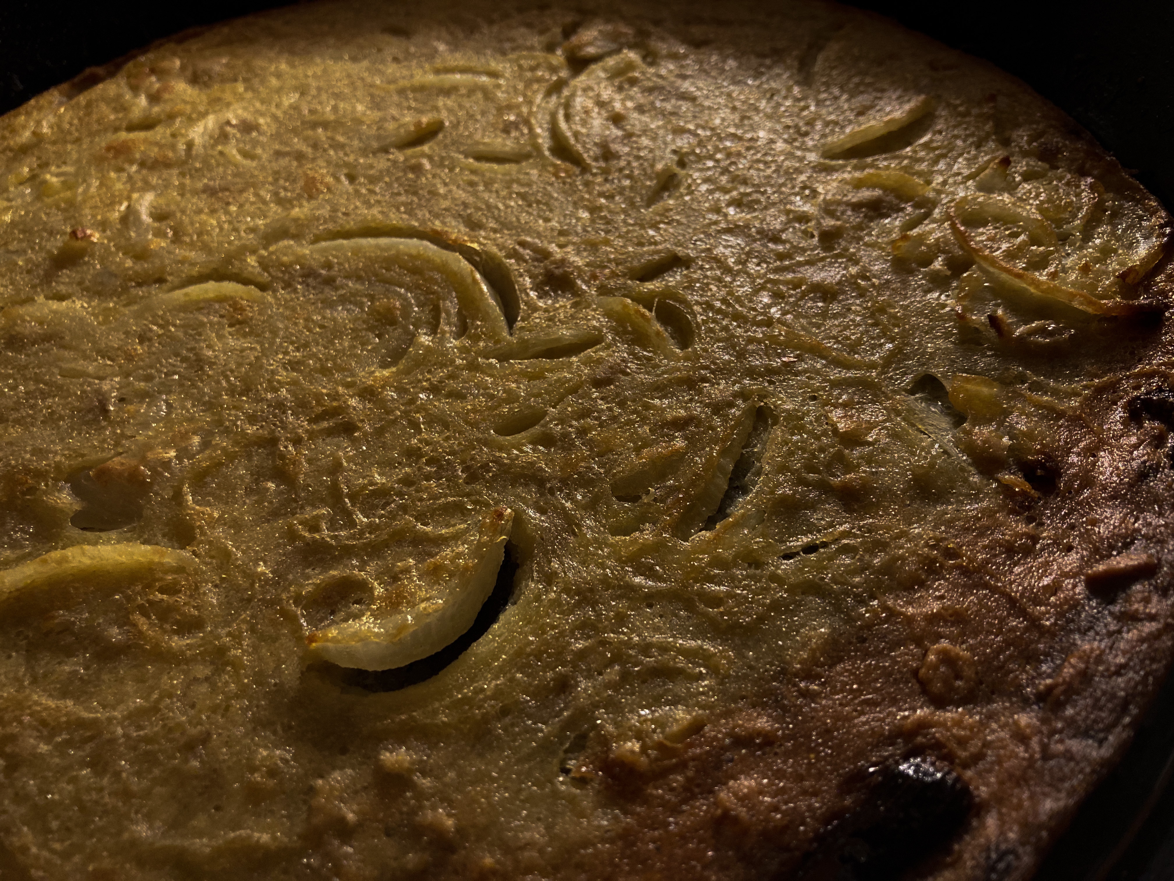 Nun gießt Ihr vorsichtig den gerührten Teig auf das Öl und vermengt vorsichtig beide Zutaten (und gebt evtl. Zwiebeln, Salsiccia etc. dazu). Es sollte aussehen, wie auf dem Bild. Die Teigmasse sollte maximal 1 cm dick sein.