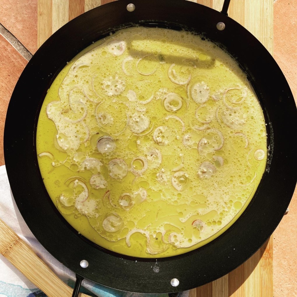 Nun gießt Ihr vorsichtig den gerührten Teig auf das Öl und vermengt vorsichtig beide Zutaten (und gebt evtl. Zwiebeln, Salsiccia etc. dazu). Es sollte aussehen, wie auf dem Bild. Die Teigmasse sollte maximal 1 cm dick sein.