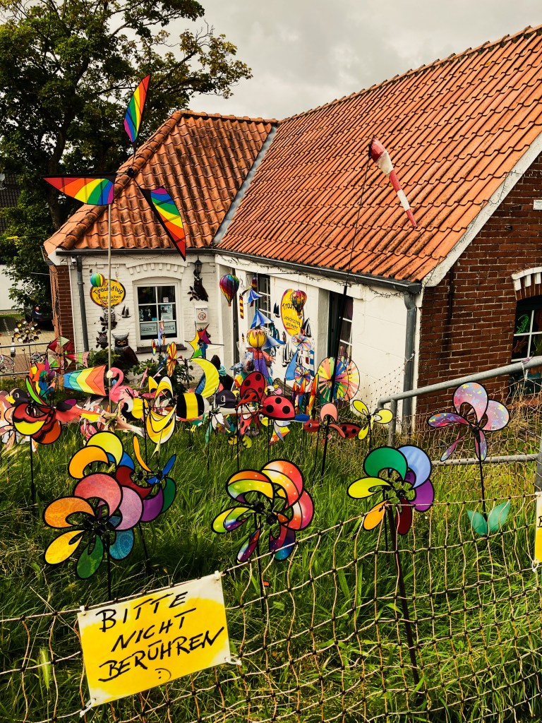 Der Tag ist wolkenverhangen und ein feiner Regen nieselt ab und an aus den grauen Wolken. Der erste Ausflug ist Pflichtprogramm, die Nordsee muß es sein. Wir fahren in das malerische Städtchen Greetsiel. Das Wetter hat nicht viele verschreckt. Es ist ziemlich viel los (aber kein Vergleich mit Sardinien), Menschen, Hunde, Camper und Kinder die im Bollerwagen durch die Gassen gezogen werden. Kleine und große Backsteinhäuser und Häuschen aus dem 18. Jahrhundert, alles total entzückend. Bunte Fischerboote im Hafen, Eisdielen, Restaurants, Mitbringselshops, Bars und Kneipen an der Promenade auf der Menschen Richtung Deich flanieren oder radeln.