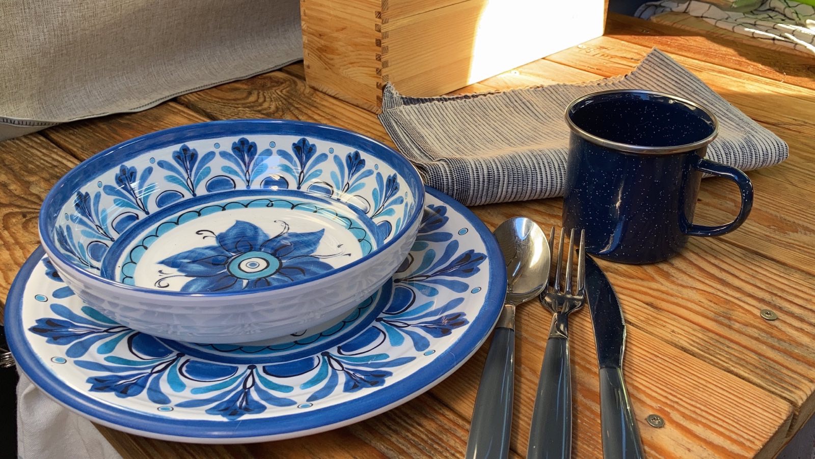 - Wasser: Ein 15-Liter-Kanister und eine Emaille-Schüssel für den Abwasch.