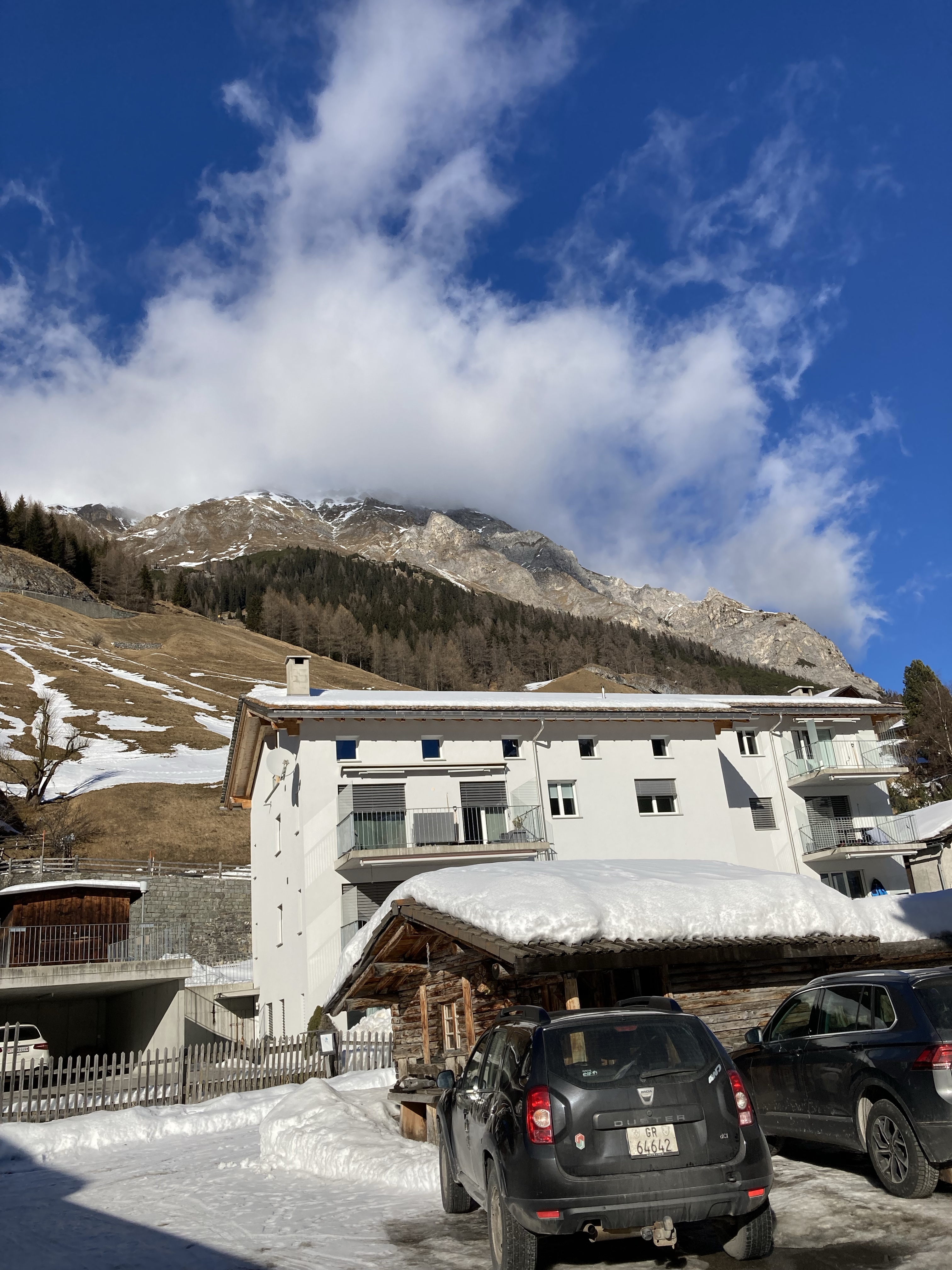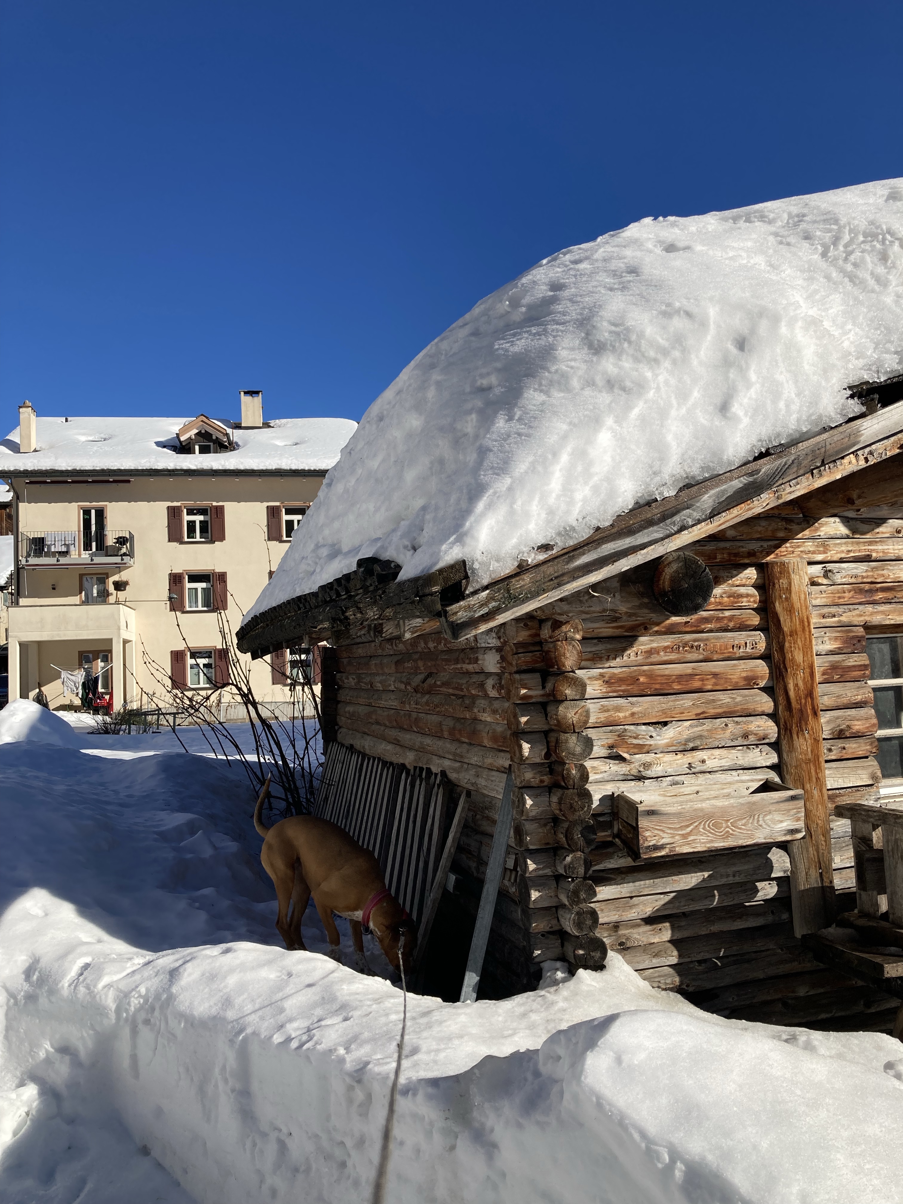 Mein Hund und ich gönnten uns eine kleine Pause in dem mit Skifahrern gut gefüllten Dörfchen Splügen. Dank meiner fürsorglichen Freundin Petri hatte ich für die Reise: