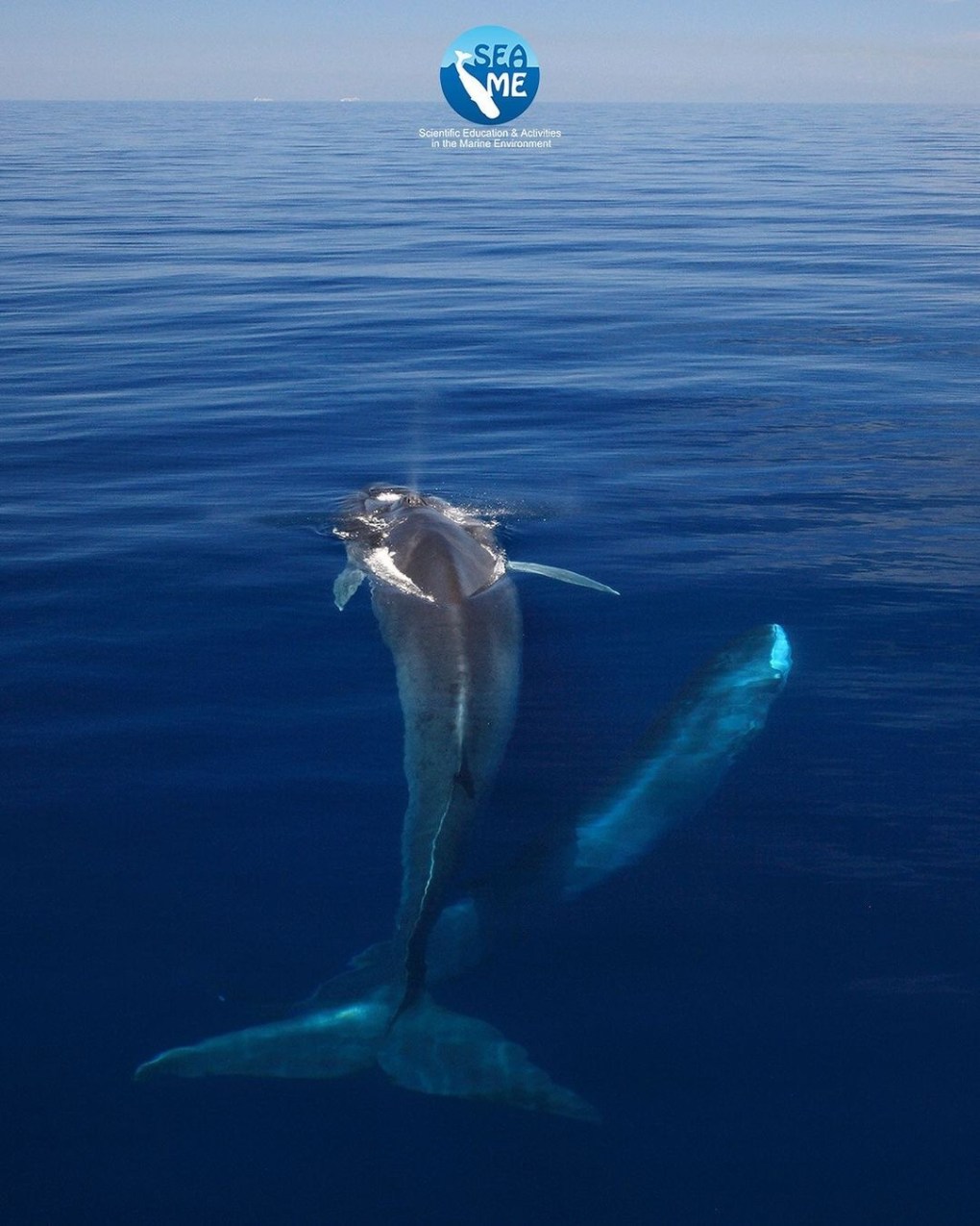 Finnwal (Balaenoptera physalus) Mama und ihr Baby. Die beiden wurden gesichtet und fotografiert während einer Forschungsausfahrt von @seame_sardinia im Unterwasser Canyon von Caprera, Sardinien.