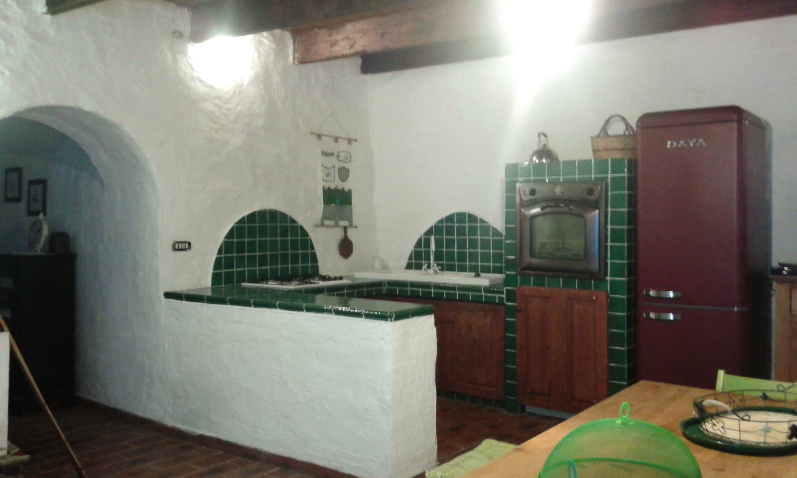 Rechter Hand führt die Treppe in die große Wohnküche mit Küchenzeile und Esszimmer. Ein Highlight der BBQ-Grill, in dem Ihr im Haus am offenen Feuer grillen könnt was das Herz begehrt. Die Küche ist komplett ausgestattet mit Kühlschrank, Waschbecken, Kochfeldern (Gas) und Backofen. Dazu alles, was Ihr zum täglichen Leben benötigt.