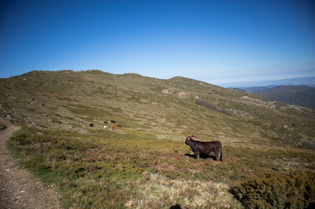 Irgendwann auf ca. 900 Höhenmetern und nach gefühlt tausend Kilometern überquere ich am Bentarte-Pass, die Grenze nach Spanien. Pilger überholen mich ständig und nach jeder Kurve folgt wieder ein neuer Anstieg. Das Nervt. Zwei Hirtenhunde ziehen mit einer Schafherde an mir vorbei, nie habe ich so riesige Glocken an den kleinen Tieren gesehen. Meine Finger sind eingefroren und klamm, Bäume gibts hier keine mehr. Es ist zu hoch, es gibt nur noch grüne Wiesen durch die sich der Weg, soweit das Auge reicht, bergauf schlängelt.